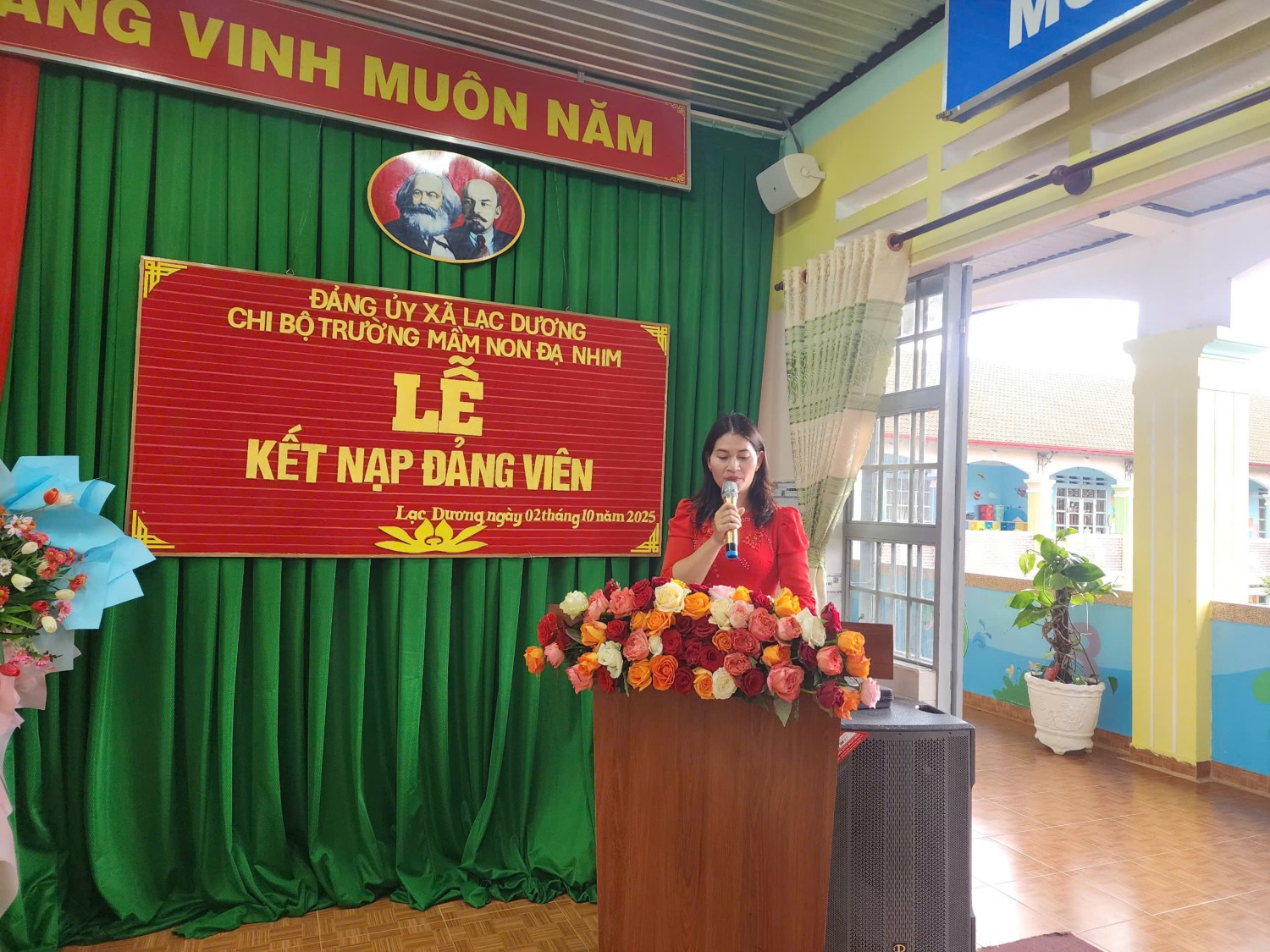 Lễ kết nạp đảng viên kết thúc trong không khí trang trọng, ấm áp và tràn đầy khí thế. Đây không chỉ là niềm vinh dự lớn lao của đồng chí Phan Thị Thuý, mà còn là niềm vui, niềm tự hào chung của tập thể Chi bộ Trường Mầm non Đạ Nhim. Sự kiện càng khẳng định quyết tâm của chi bộ trong việc xây dựng tổ chức Đảng ngày càng trong sạch, vững mạnh, góp phần hoàn thành tốt nhiệm vụ chính trị được giao.