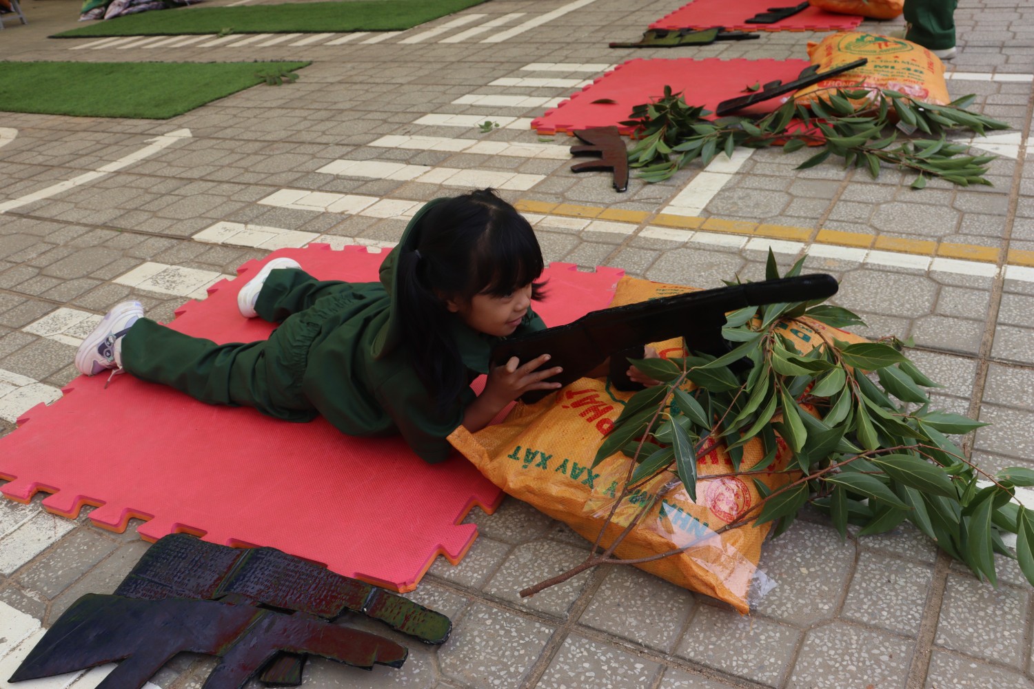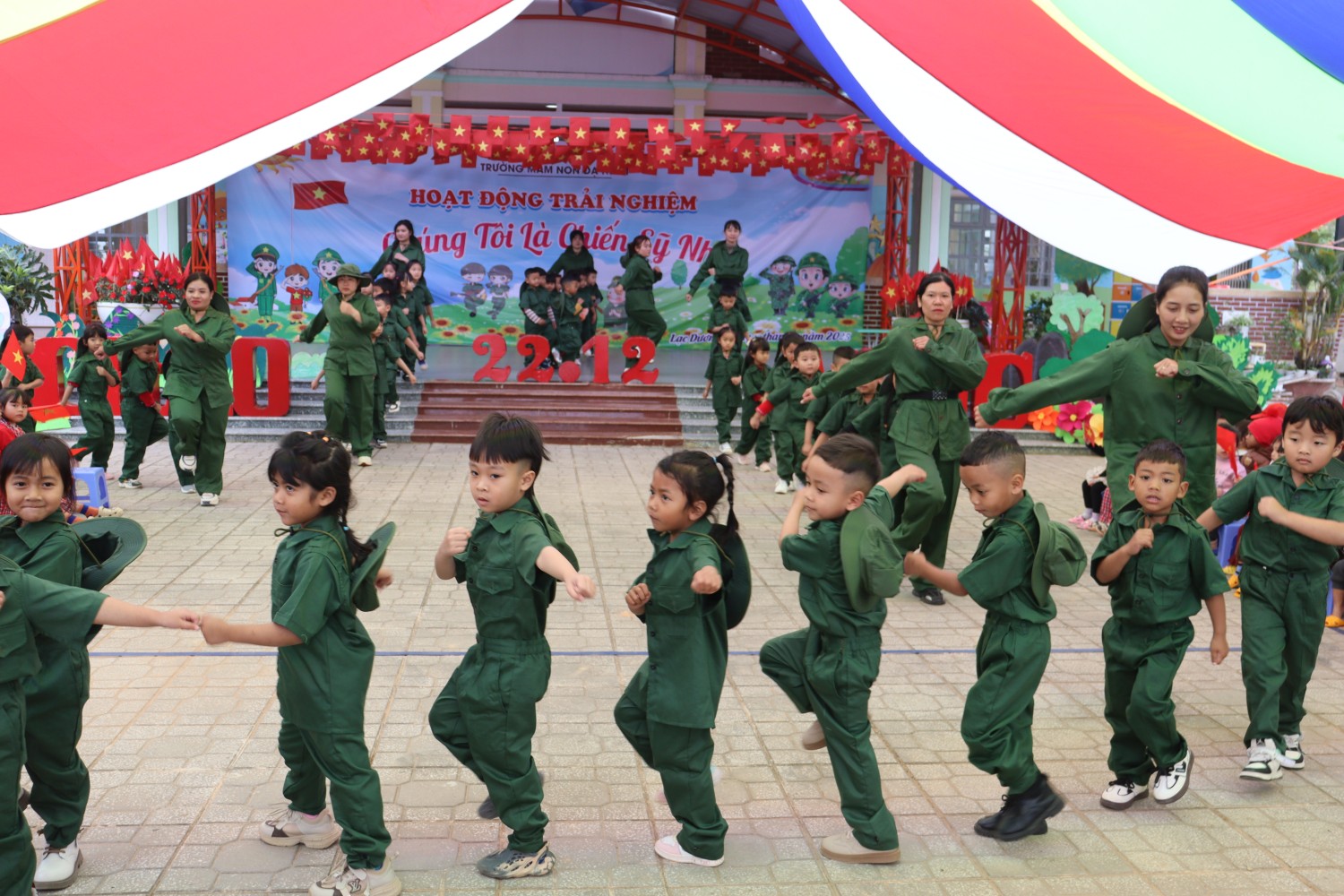 Hoạt động trải nghiệm có sự tham gia của các cháu đến từ các lớp Lá trong toàn trường. Trẻ tham gia hoạt động trong trang phục bộ đội gọn gàng, an toàn, với tác phong nghiêm túc, vui tươi, đúng tinh thần “chiến sĩ nhí”.