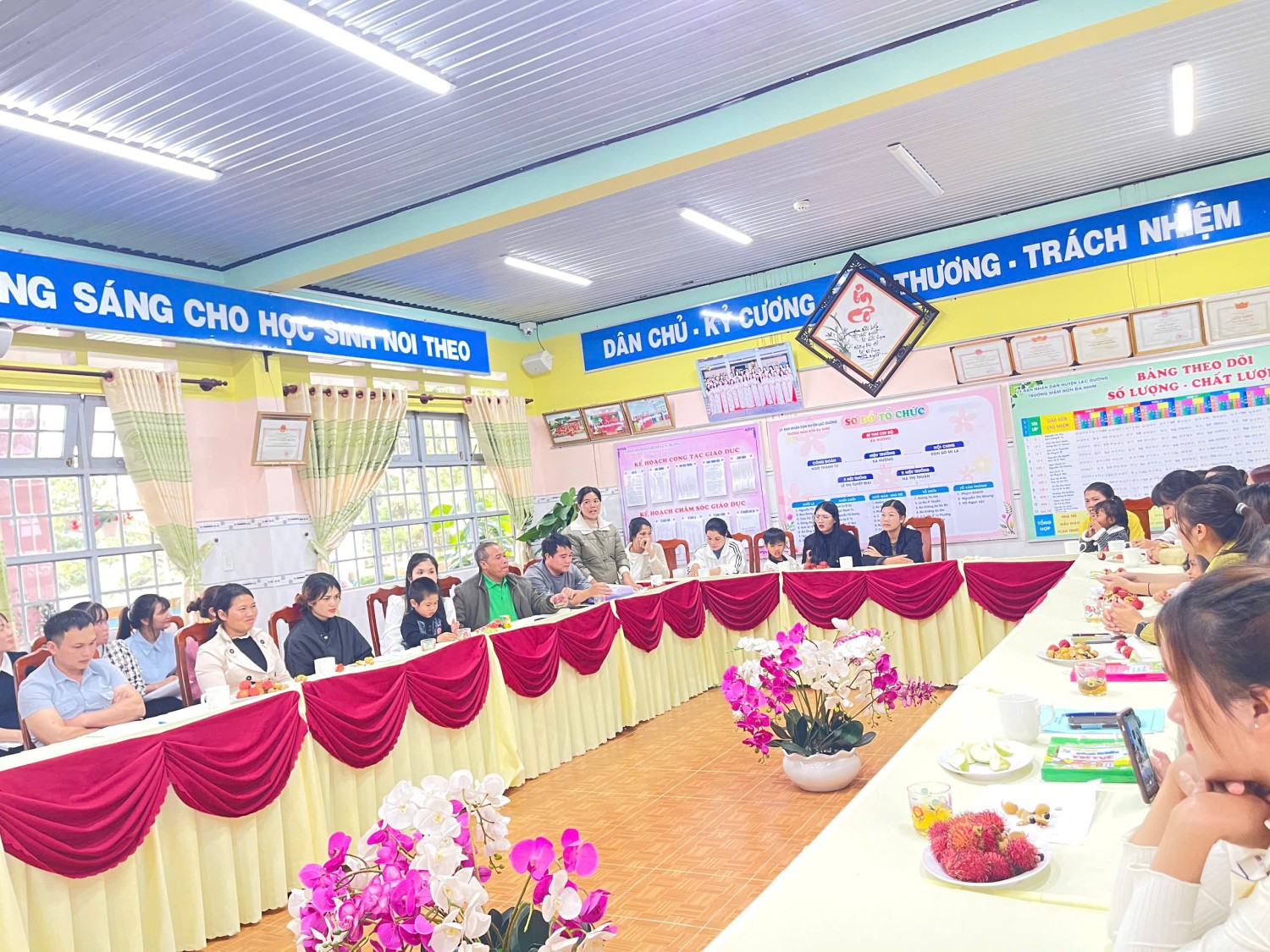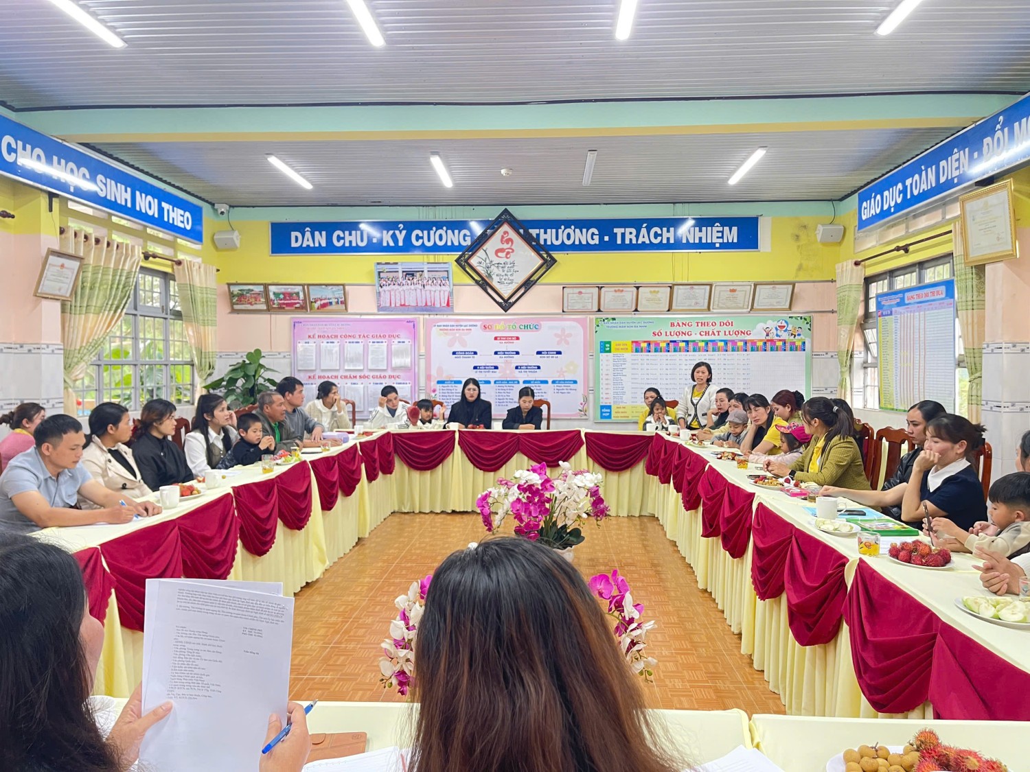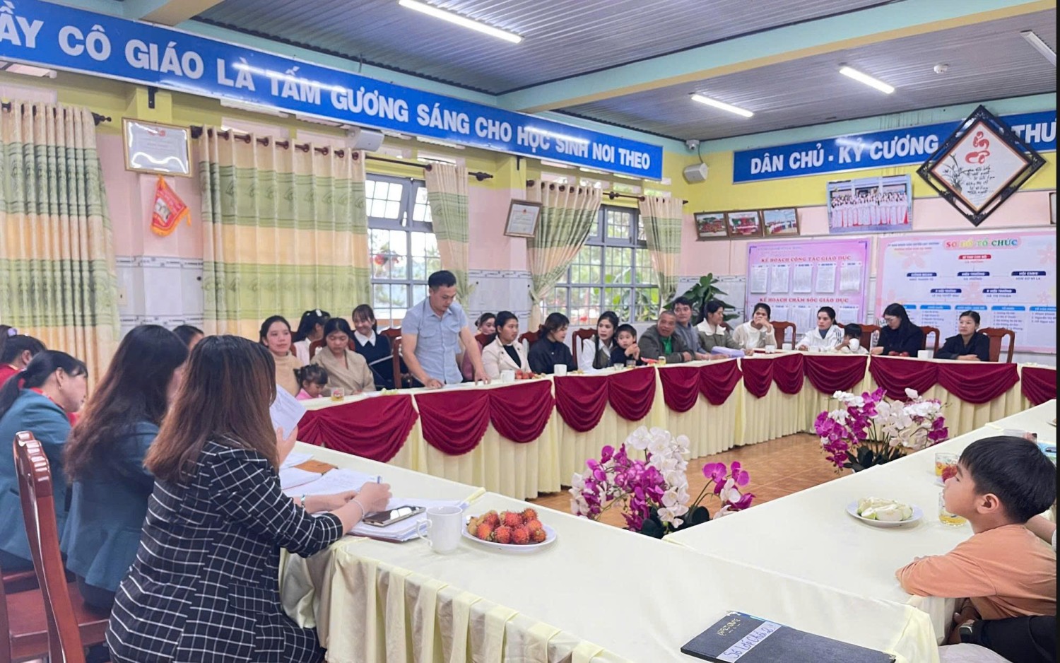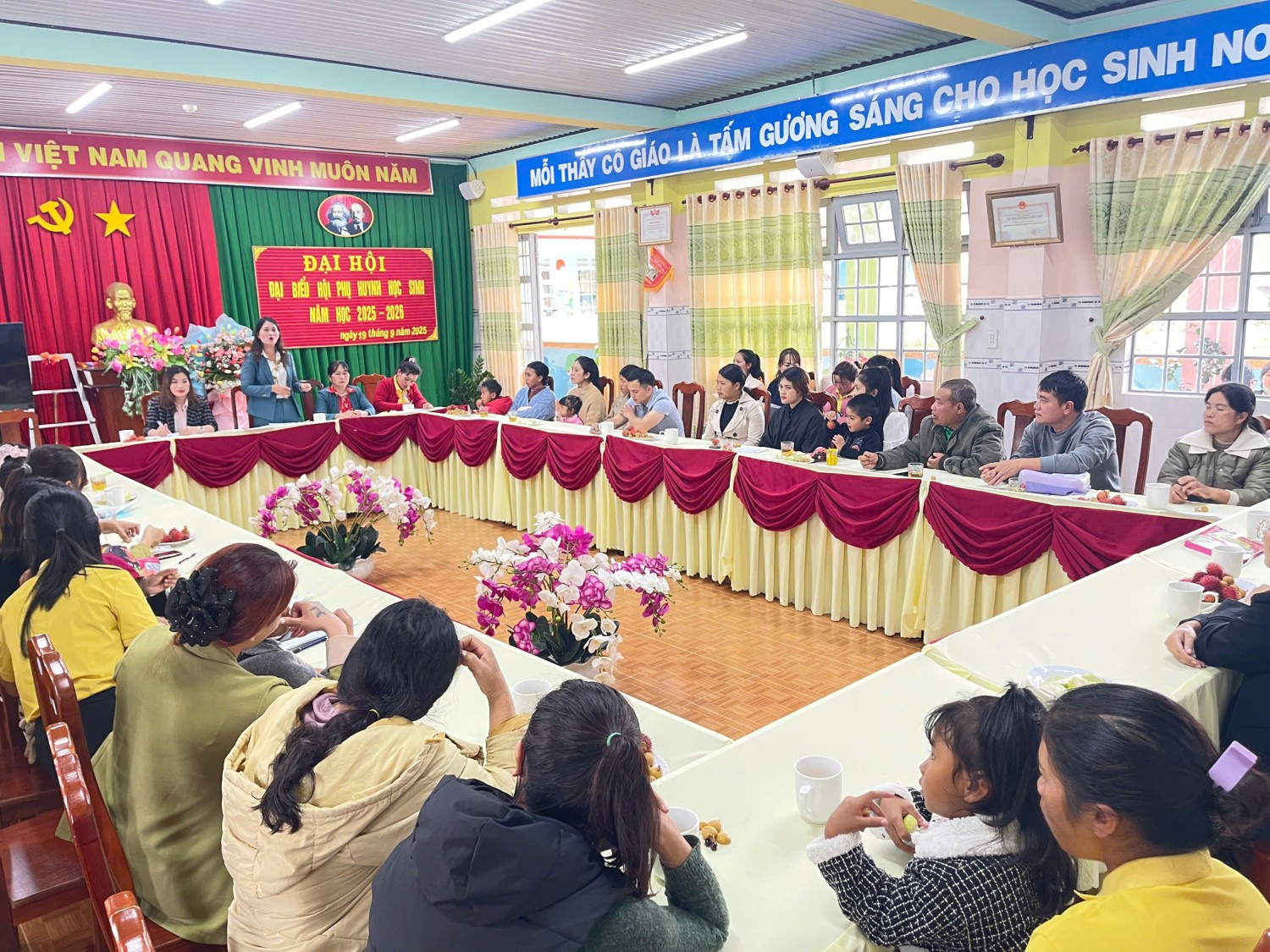 Tại buổi họp, cô Ka Hường – Hiệu trưởng nhà trường đã báo cáo một số kết quả nổi bật trong năm học vừa qua, đồng thời quán triệt các nhiệm vụ trọng tâm trong năm học mới và thông qua Nghị quyết 385/NQ-HĐND ngày 10/12/2024 của Hội đồng nhân dân tỉnh Lâm Đồng về danh mục các khoản thu, mức thu, cơ chế quản lý thu chi đối với dịch vụ hỗ trợ hoạt động giáo dục, đào tạo tại các cơ sở giáo dục công lập. Đồng thời, chính sách miễn học phí cho toàn bộ trẻ đang học tại trường giúp phụ huynh yên tâm, giảm bớt gánh nặng kinh tế và khuyến khích trẻ đến trường đầy đủ. Sau đó, đại diện Hội phụ huynh đã thông báo một số hoạt động nổi bật của năm học trước, góp phần tăng cường sự phối hợp giữa nhà trường và phụ huynh.