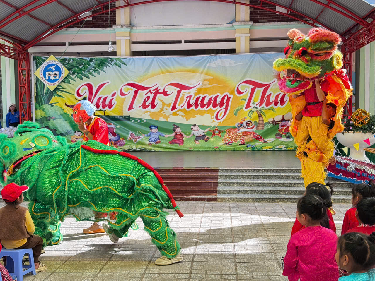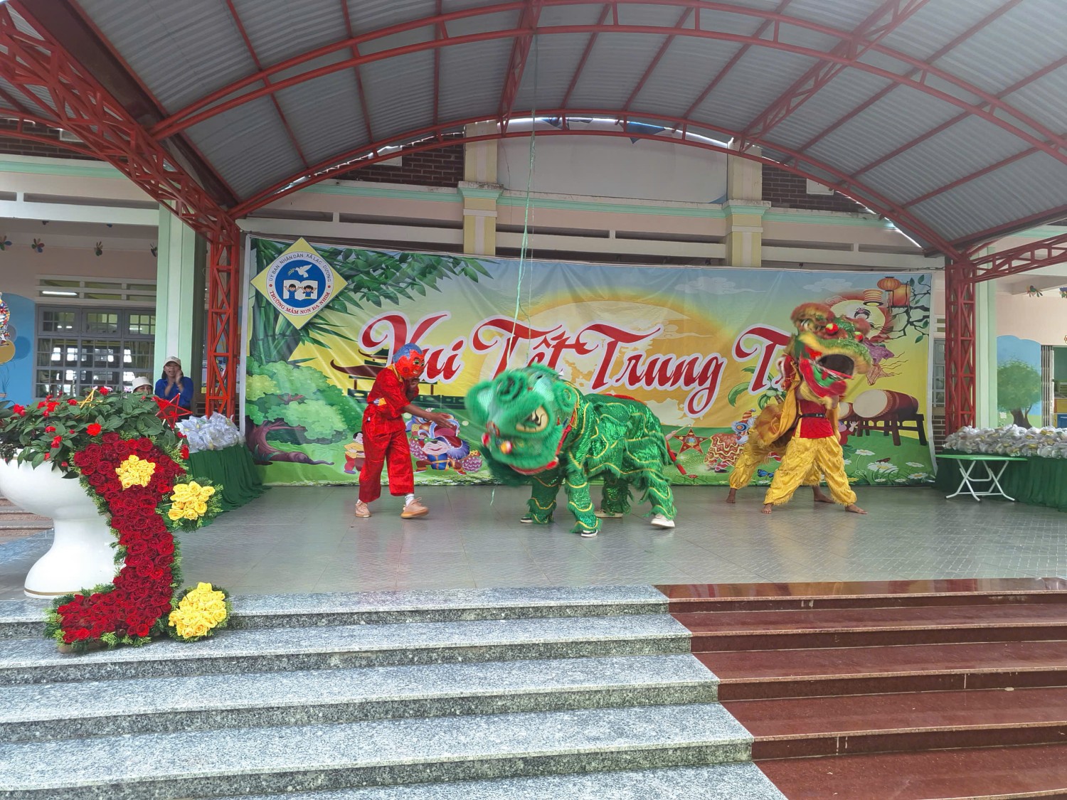 Ngay từ đầu giờ chiều, khuôn viên trường đã trở nên rực rỡ với cờ hoa, đèn lồng và những mâm cỗ Trung thu đầy sắc màu. Tiếng cười nói rộn ràng của các bé hòa cùng âm thanh tưng bừng của màn múa lân mở màn đã làm cho không khí hội thêm náo nhiệt.
